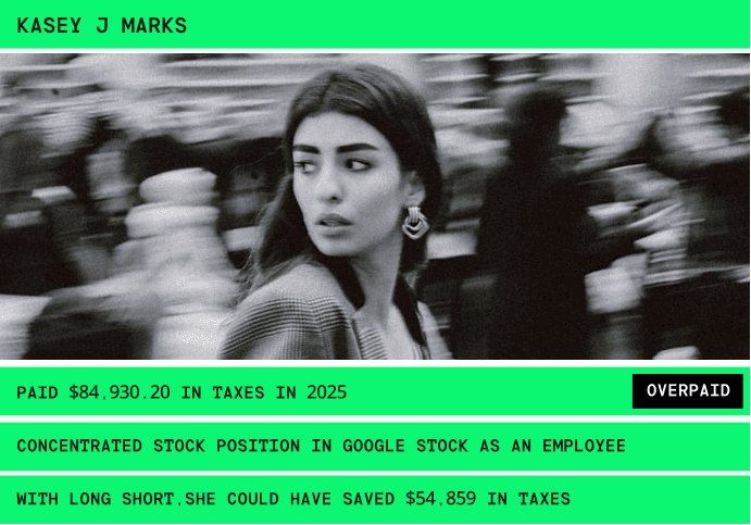 After 10 years of RSU vesting, over 60% of her net worth was tied up in GOOG. She needed to diversify without triggering a massive tax event in one year.